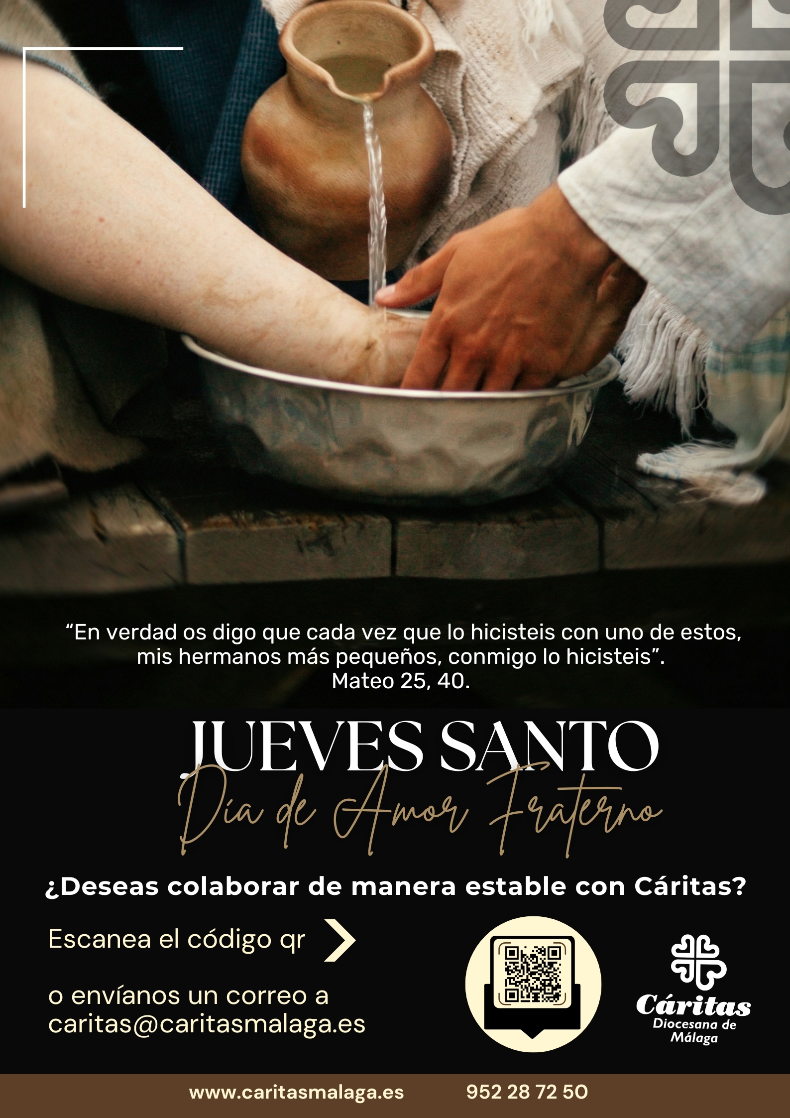 La celebración del Jueves Santo puede ser uno de los momentos más oportunos para concienciar a la comunidad parroquial sobre la necesidad de intensificar el testimonio de la caridad y, aunque no haya colecta imperada, Cáritas hace una llamada, en este día tan significativo, para animar a todos los miembros de nuestras parroquias a colaborar con Cáritas. En las parroquias se repartirán unos recordatorios con un código QR de acceso a un formulario para que, quienes lo deseen, puedan comenzar a colaborar no solo con una aportación puntual sino con un compromiso estable.